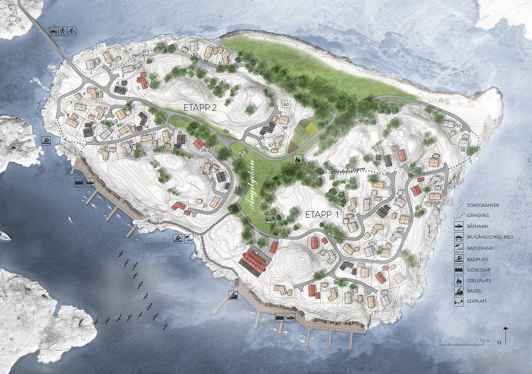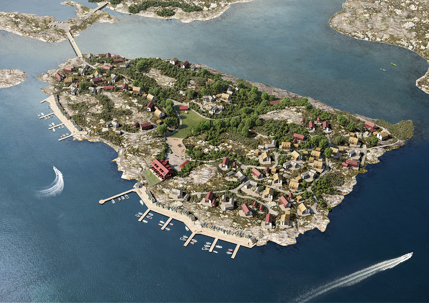 Lilla Fjellsholmen omfattar 63 friliggande hus i ett och ett halvt plan. Till varje hus hör ett gästhus på 19 kvm, egen sjöbod på åtta kvm och båtplats. Husen är ritade för Lilla Fjellsholmen av CREAM Architects.